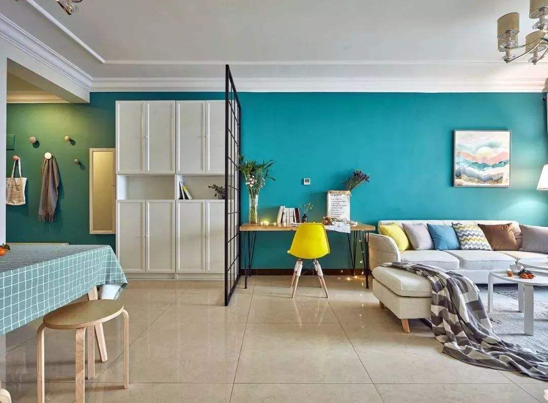 為了更好看,我們也可以適當修改一下電視牆上的造型。利用造型,從視覺上分隔出讀書功能區和客廳功能區。比如在與沙發等長的電視牆上刷藍色乳膠漆,在讀書區正對著的電視牆上刷粉色乳膠漆。