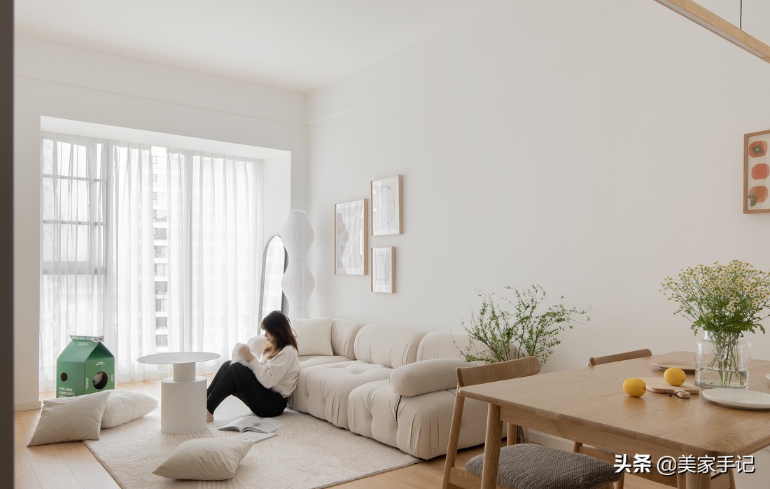 屋主是一對年輕的小夫妻,他們喜歡簡潔明亮的效果,這樣回到家,令人感受到輕鬆自在的同時,還特別的溫馨治愈。所以我們會看到女主在硬裝上,只刷了暖白色的乳膠漆,然後就連吊頂也沒有做,如此看著有種家徒四壁的感覺,不過這些在搭配簡約的裝飾畫、松軟舒適且簡約高顏值的沙發和充滿生機與活力的綠植後,頓時就有種了一種歲月靜好的氛圍,尤其在地毯和柔美窗簾的烘托下,就更是如此了。