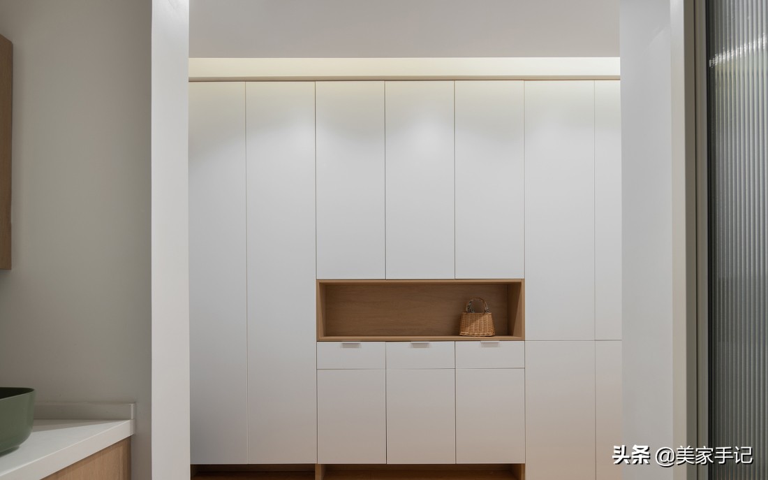 站在廚房看對面,也就是進門左側定制的鞋櫃,其中櫃門採用白色的免拉手結構,這樣乾淨整潔的立面,猶如裹上了一層飾面板,既顯得簡約純粹,也放大了視覺空間的同時,提亮了空間。細節上,櫃底懸空便於碼放鞋子,加上中部鏤空的地方,用來擺放進出門需要用到的小物品,如鑰匙和手包等等,功能非常的強大。
