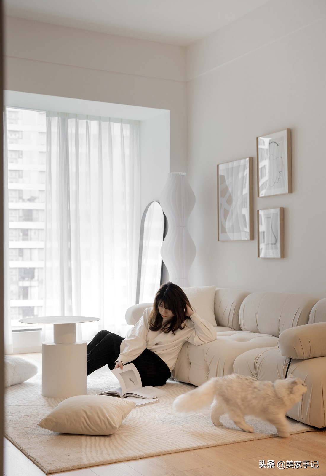 補充一下細節,主要是奶油色的沙發,在大面積白色背景的映襯下,可鹽可甜。另外就是屋主養的兩只貓咪了,非常可愛。