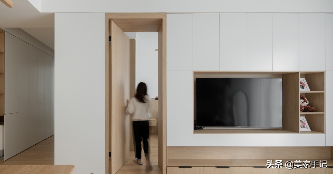 另一面是電視牆,直接通過定制整體櫃的方式,來為室內增添更多的收納機能,這樣不僅實用,還美觀大氣且富有層次感。左側的話,可以看到主臥的隱形門,好處在於整體性強,不會顯得突兀。
