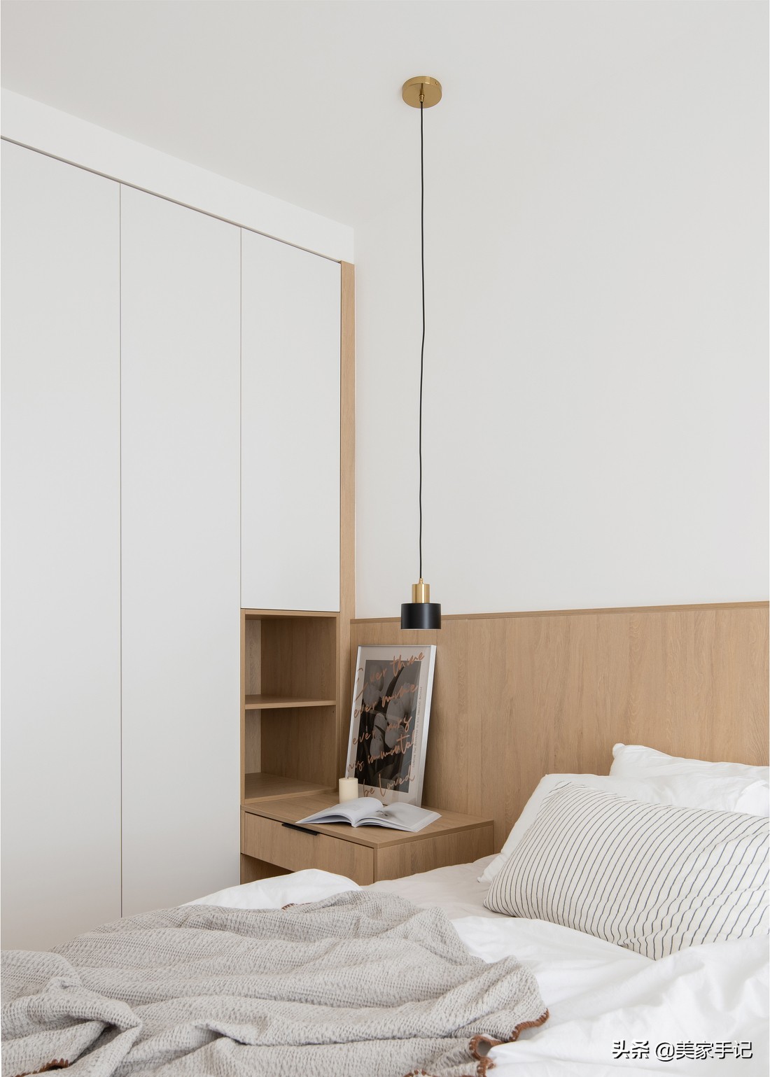主臥延續了之前的風格,背景牆只刷白色的乳膠漆,然後搭配兼具床頭靠背功能的護牆板就可以了,此時再加上柔軟舒適的床品,還有懸空的床頭櫃和梳妝台等等,無疑營造了一個落落大方且溫馨舒適的睡眠環境出來。