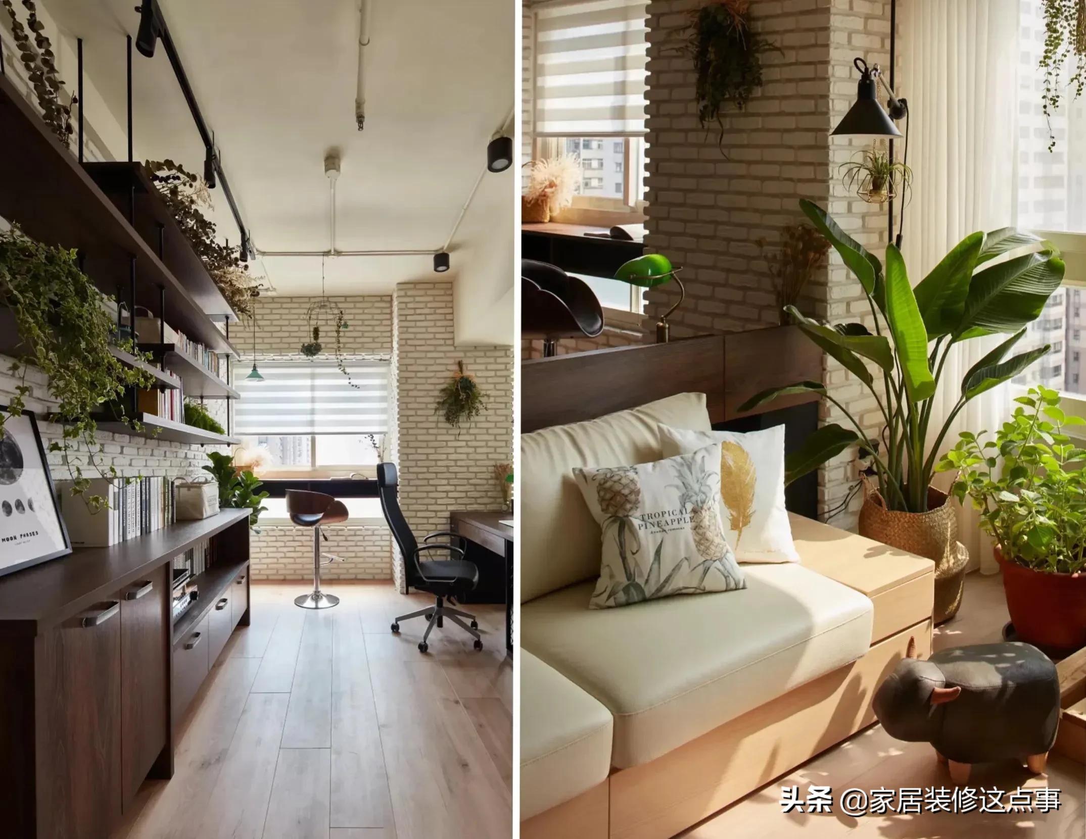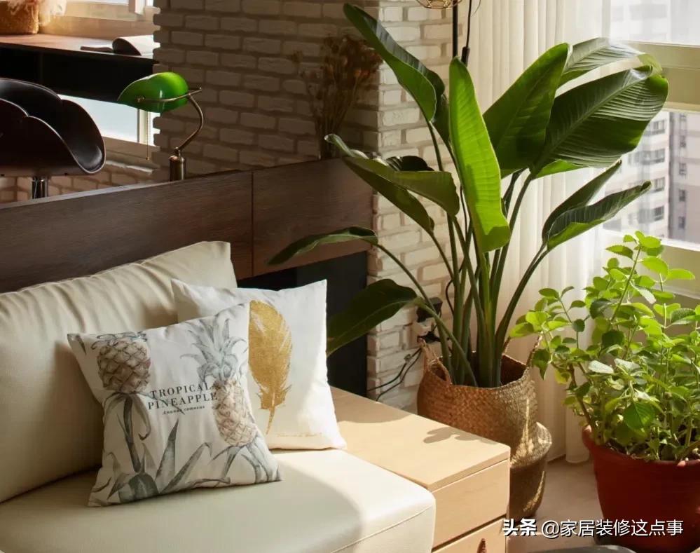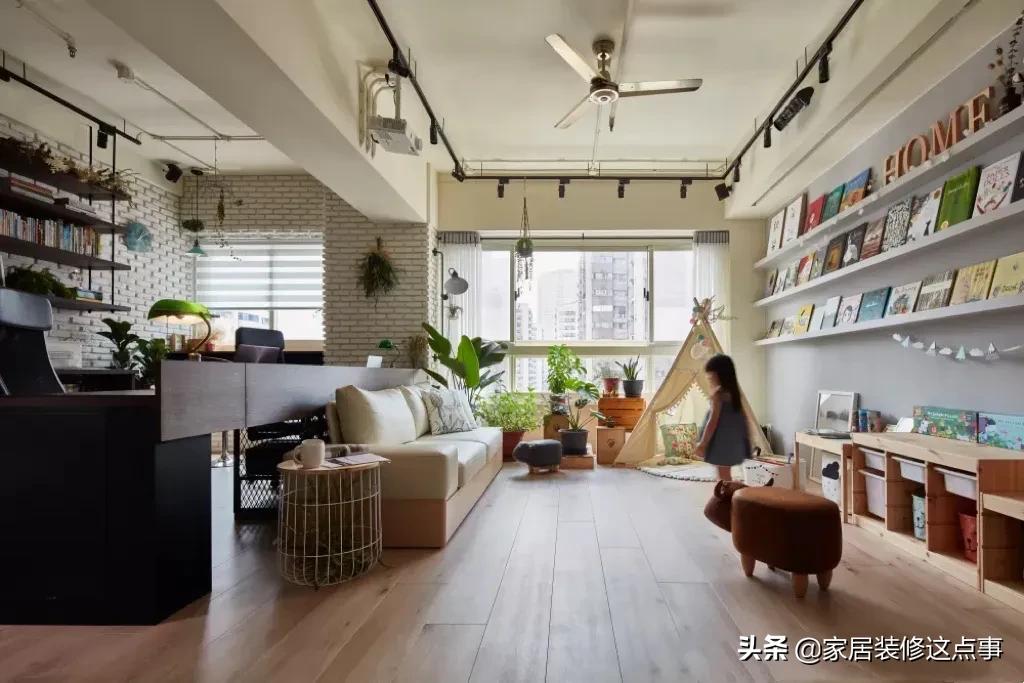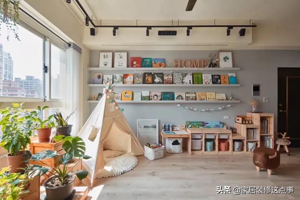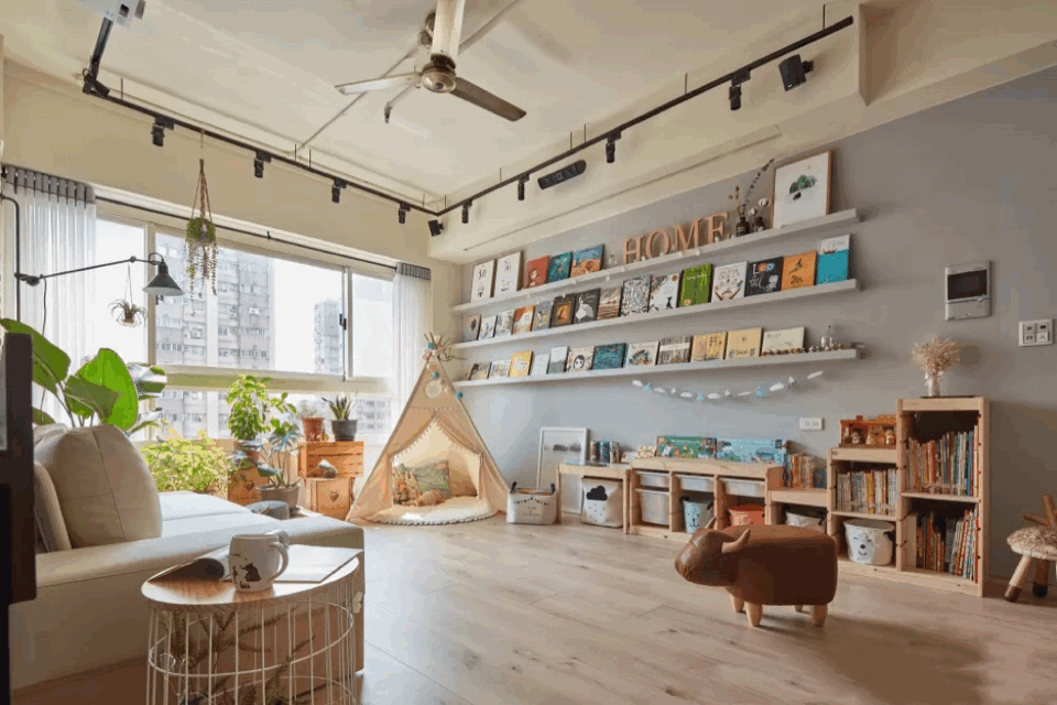 沙發對面,雖說沒有傳統的電視機配電視牆那麼好的裝飾效果;但是女主會根據孩子的不同年齡層換上不同的益智兒童玩具以及繪本,加上綠植的點綴,卻散發著另類的溫馨感。