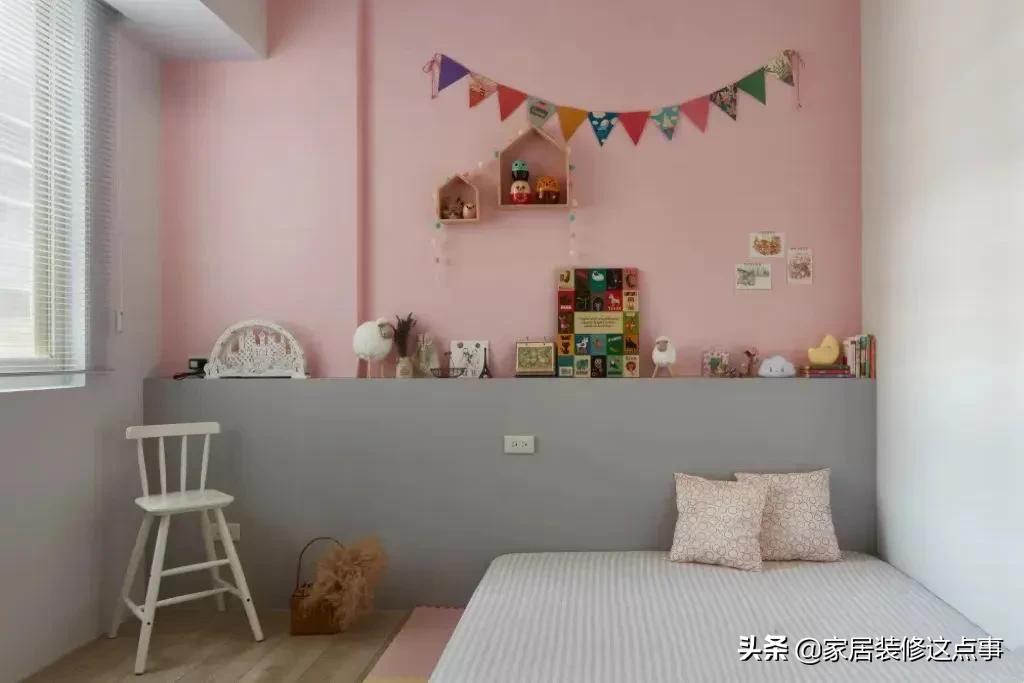兒童房雖然靠窗有凸突的立柱,不過設計師在這塊給屋主利用木板結合木龍骨做了一個約10公分厚的床頭靠背修飾,可以作為床頭櫃使用,也化解了立柱的突兀感,很讚哦!