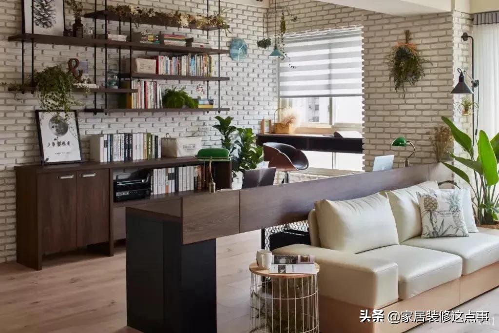 打通後書桌與沙發「背靠」排列,這樣設計讓兩塊區域有明顯的區域劃分,顯得很寬敞、也很有秩序感。