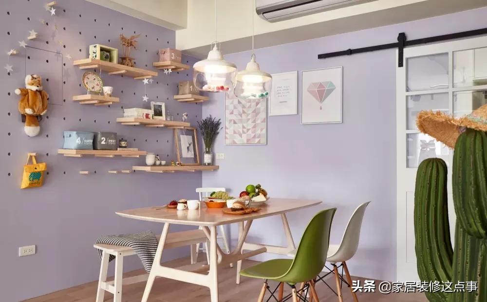 餐廳背景牆洞洞板處,是用木工板做出來的造型;配合木釘結合隔板,起到裝飾牆面的作用、也充當了餐邊櫃的功能,很實用也很美觀。