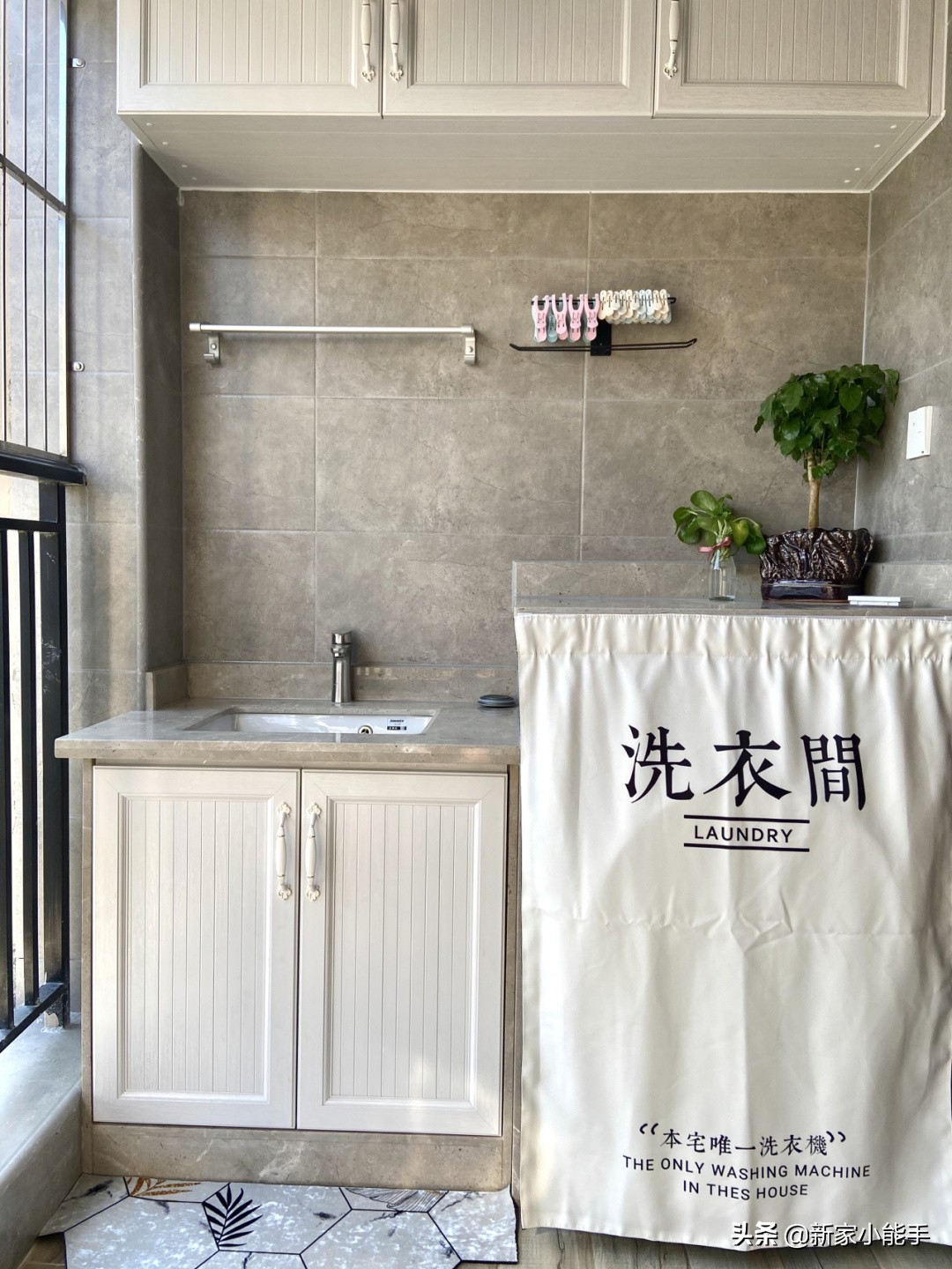 陽台定制了高低台面的浴室櫃,右邊剛好預留了位置可以放洗衣機,為了防灰塵防曬,所以安裝了一塊小窗簾可以適當擋住,給人的感覺太舒適了。不管是在這里機洗還是手機,都方便很多。
