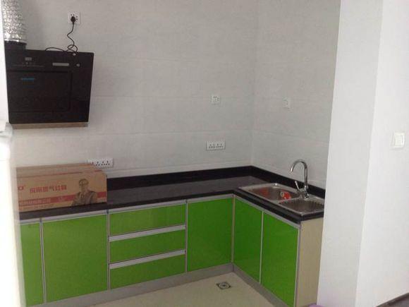 廚房的裝潢,廚房定制的櫥櫃,白色的牆磚,櫥櫃顏色是綠色的,黑色的操作台面,我看鄰居家大部分也是這樣裝潢的。