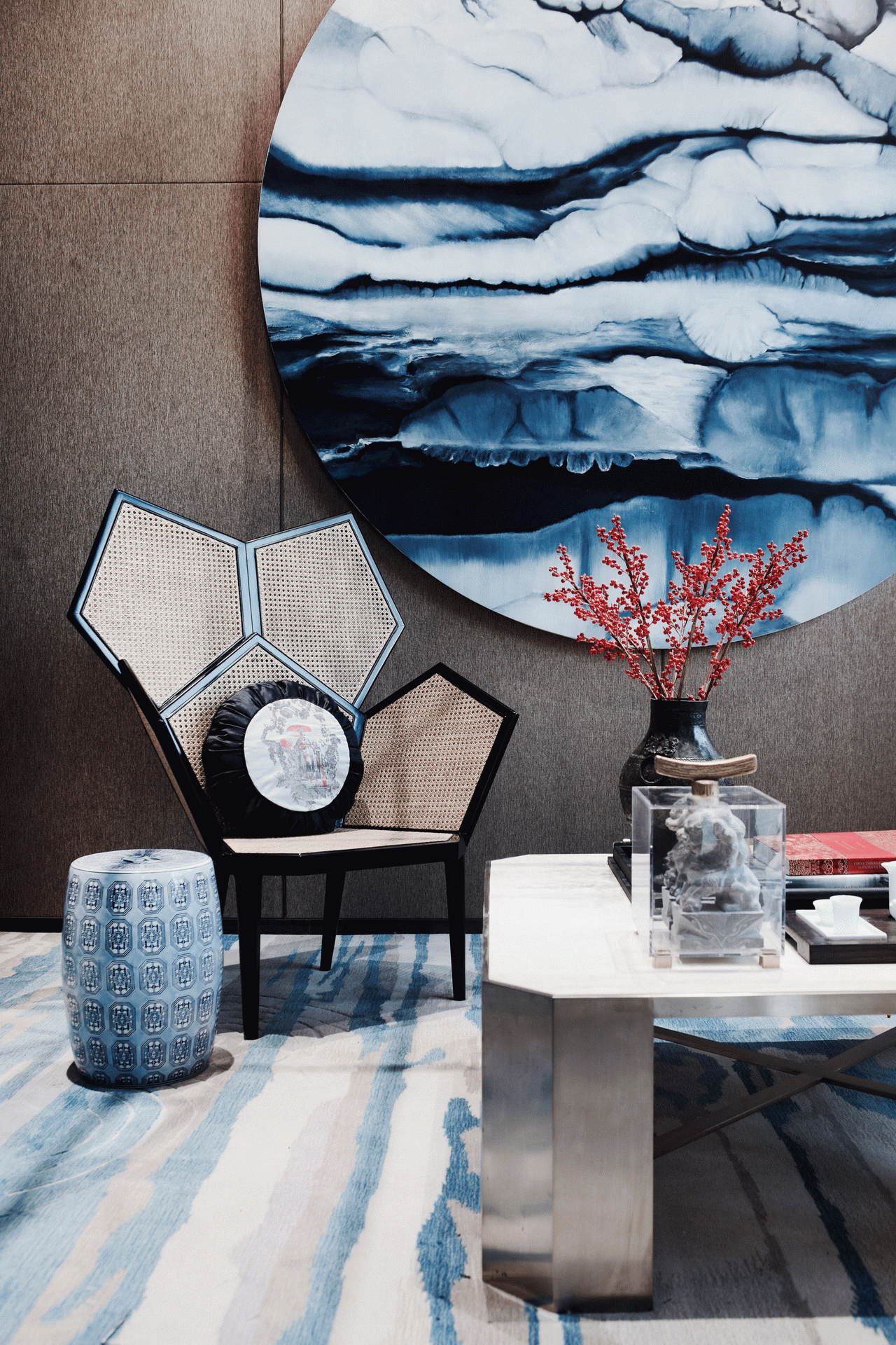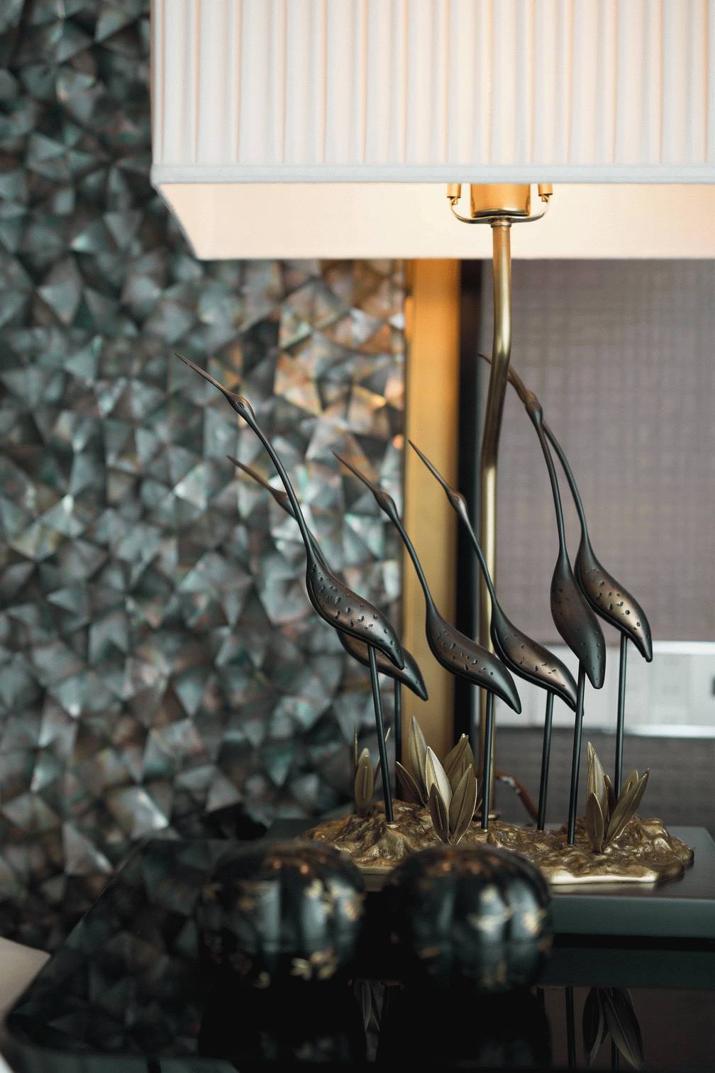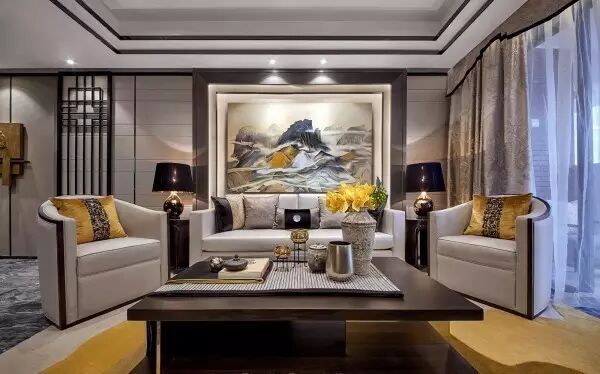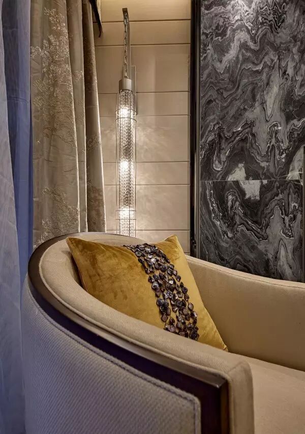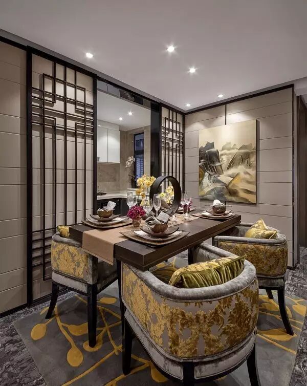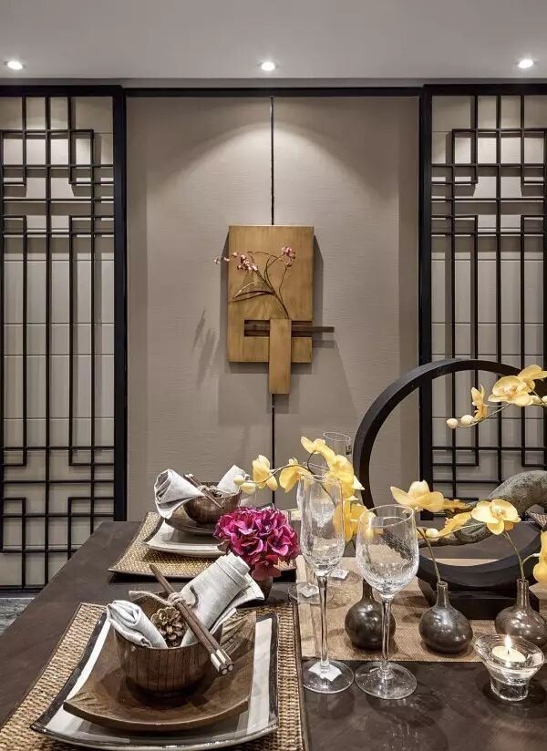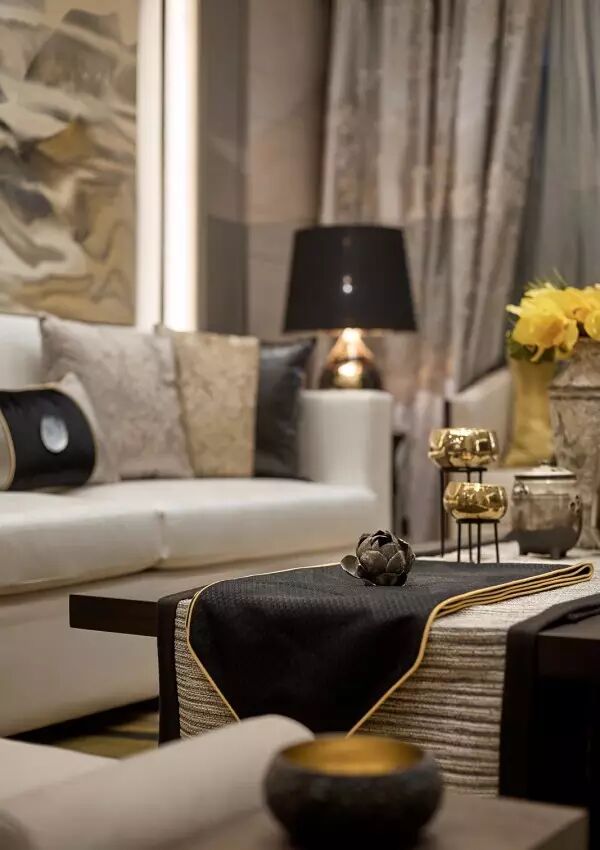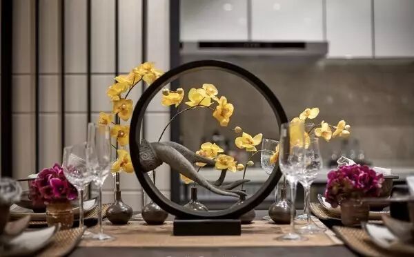 家庭廳的設計中,茶幾使用全新創意亞克力與純手工敲銅,在視覺上取得了精美的平衡中心;非傳統手工裝飾畫,傳遞迥然有別於世界其它地域的東方風情;金屬樹枝牆掛,形成生趣盎然的點睛之筆。