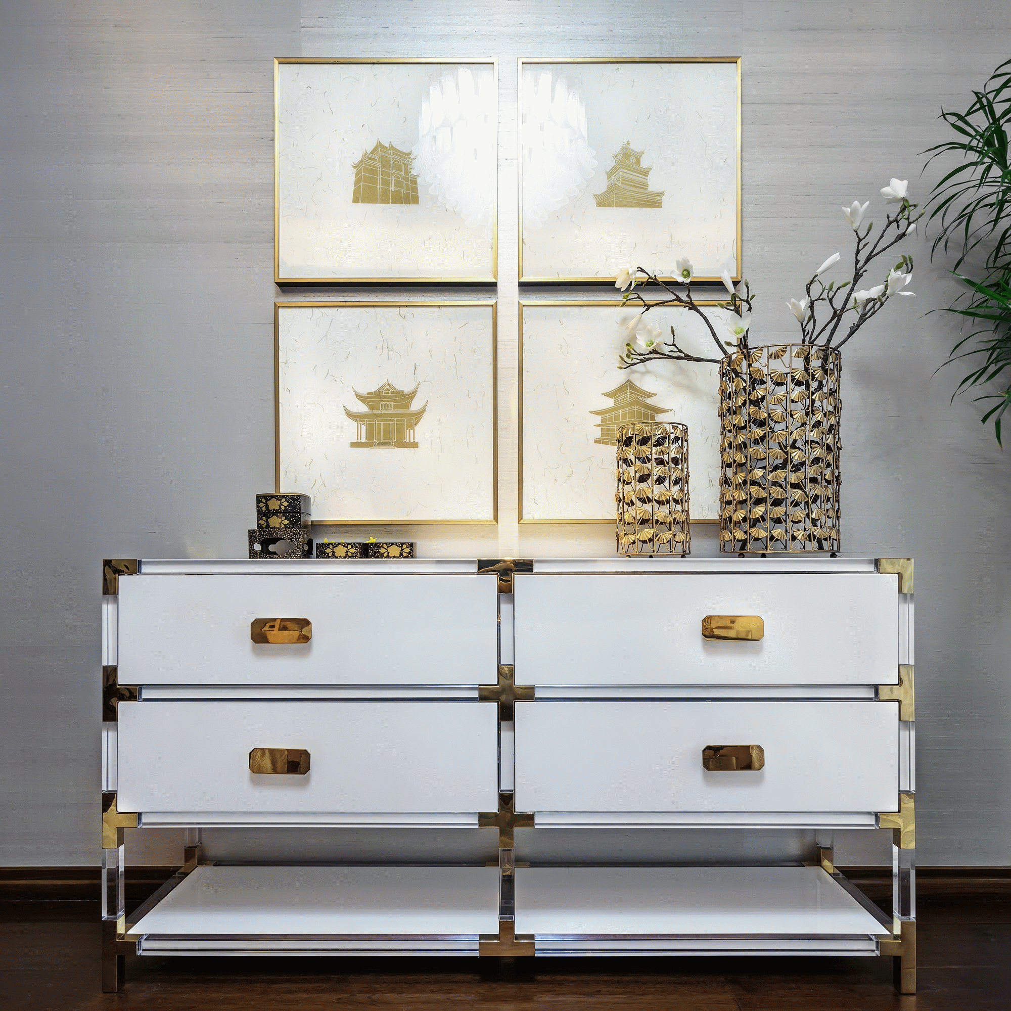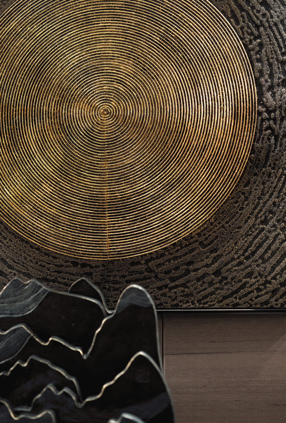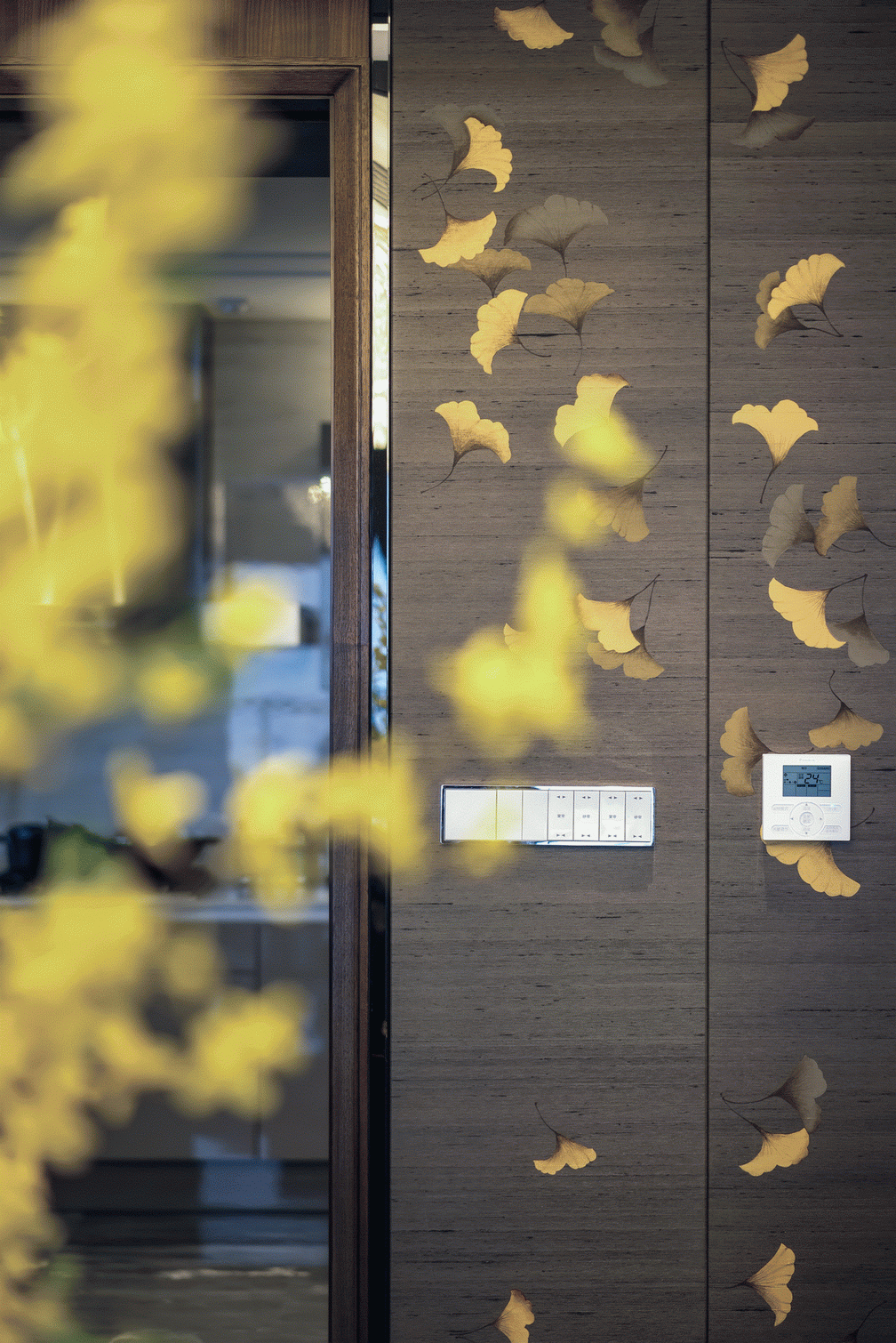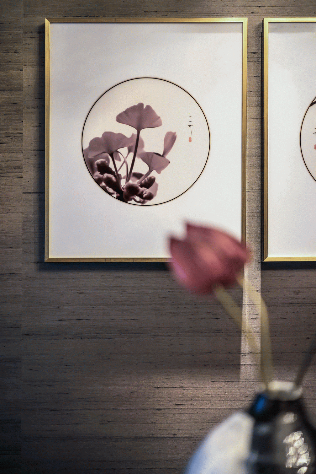 家庭廳的設計中,茶幾使用全新創意亞克力與純手工敲銅,在視覺上取得了精美的平衡中心;非傳統手工裝飾畫,傳遞迥然有別於世界其它地域的東方風情;金屬樹枝牆掛,形成生趣盎然的點睛之筆。