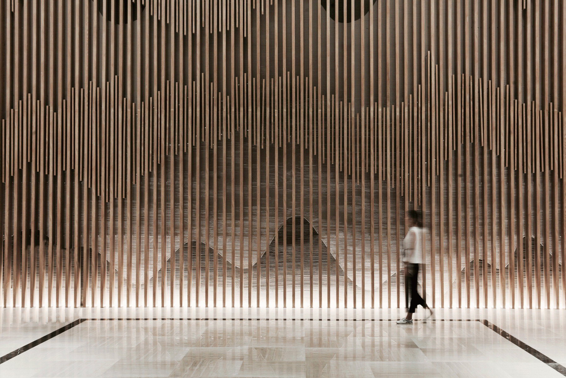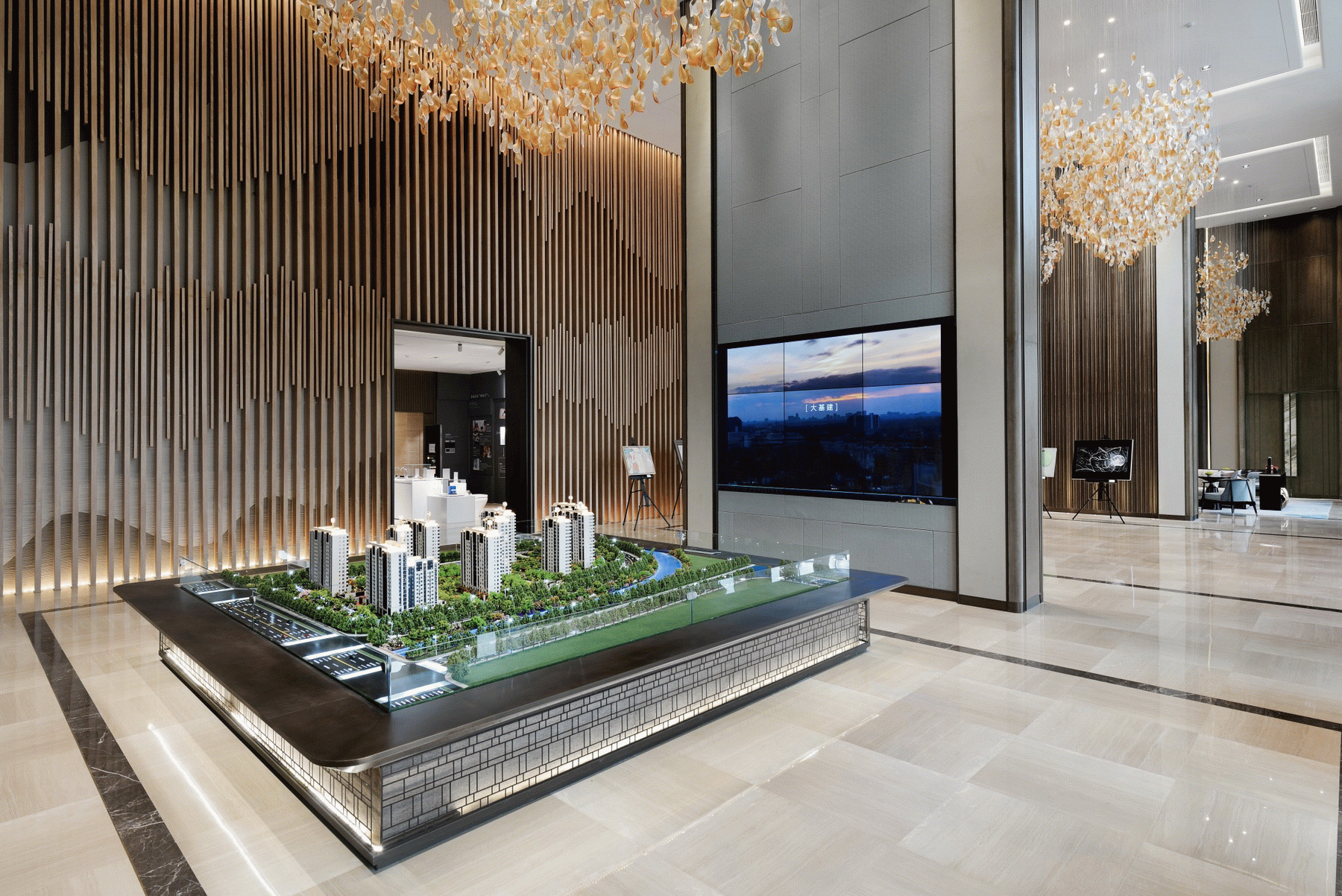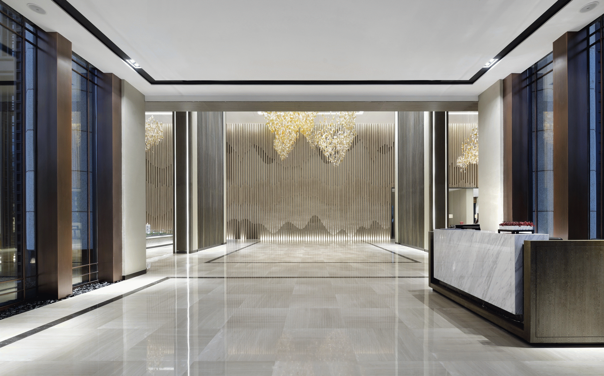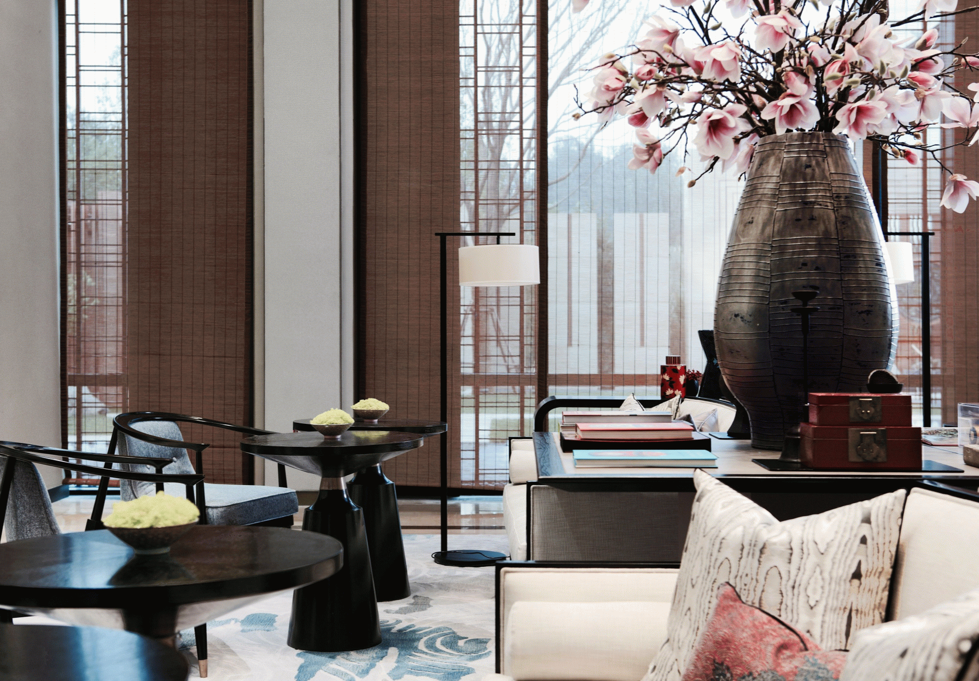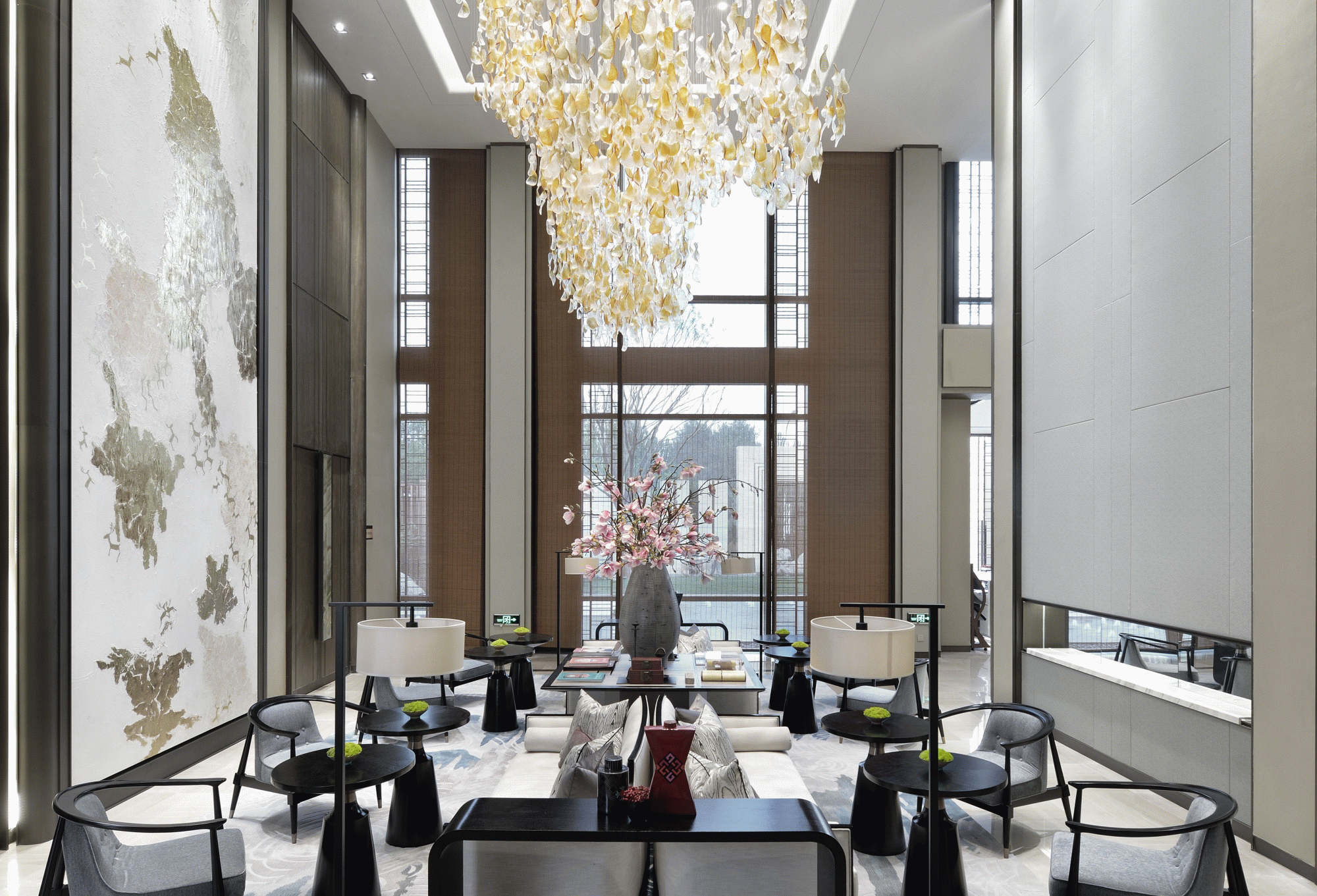 在海珀雲翡的設計中,以文化為內核,進行提煉和度越,在這裡你可以看見清新華麗的海派與深厚雋永的京派相對話。在設計中,為了增強訪客感官體驗,設計師並不局限於室內,更注重內外景之融合。從整體參觀東棟著手,研習園林造景,步入室內前,景觀與水面相印,建築靜影沉璧。