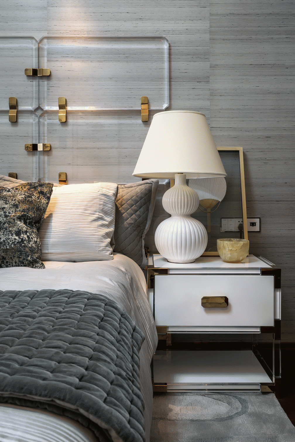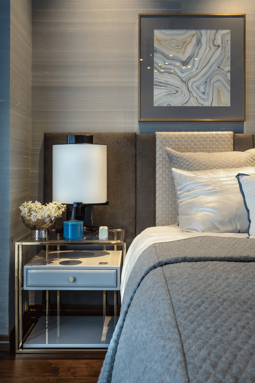 次臥以素雅的白營造靜中之境,剔除雜瑣碎的裝飾,特殊定制的床頭與邊櫃形成呼應,簡潔的形式、柔和的線條,清寂的花藝,共同營造一種超凡脫俗的美。